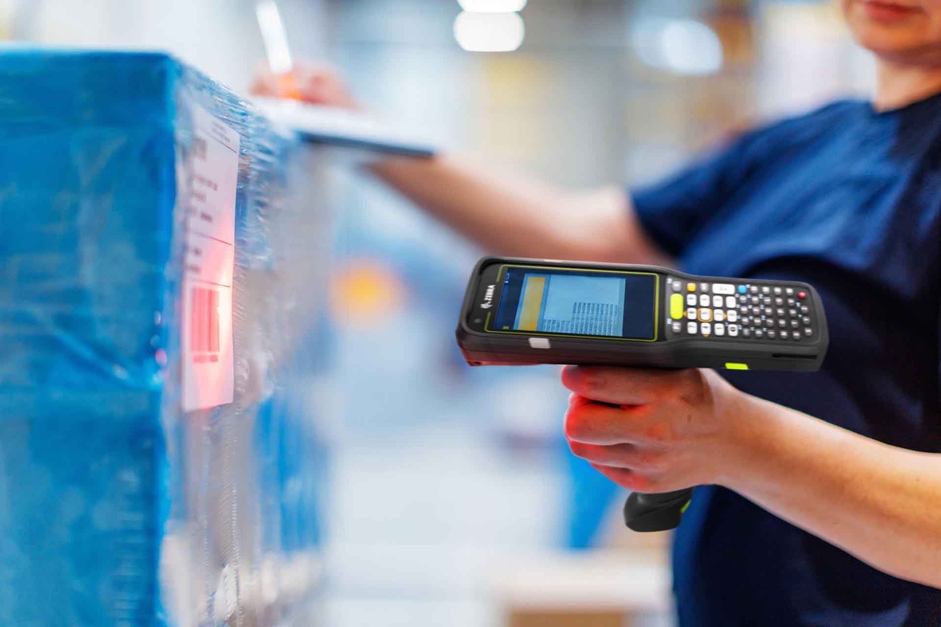 Worker using a Zebra handheld mobile computer to scan a pallet barcode.